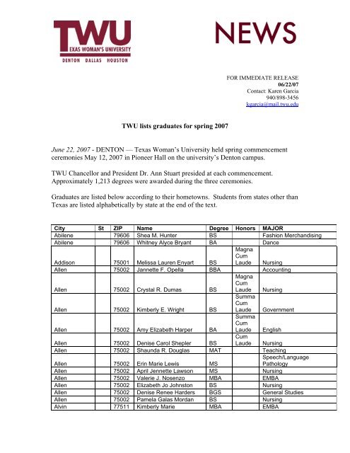 Of Spring 2011 Graduates Spring Commencement Ceremonies Were Held In Pioneer Hall On The University S Denton Campus And May Twu Releases List Of Spring 2011 Graduates