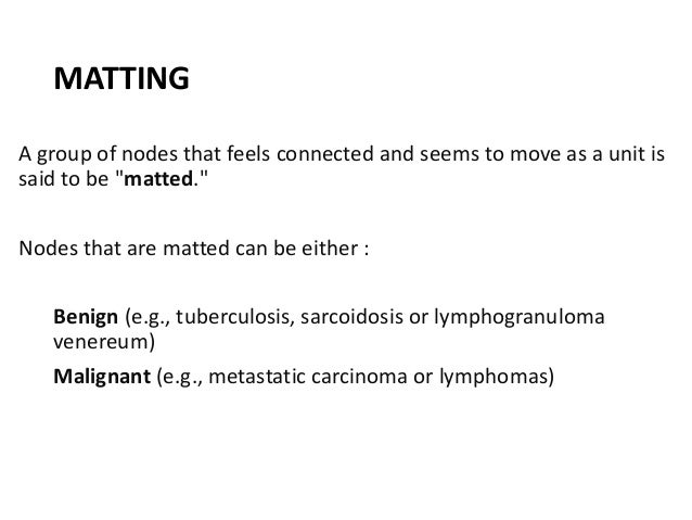 A group of nodes that feels connected and seems to move as a unit is said to be matted nodes that are matted can be either benign e g tuberculosis sarcoidosis or lymphogranuloma venereum or.