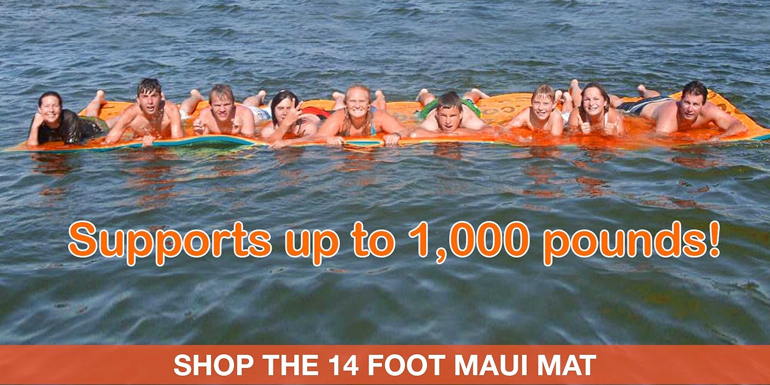 The maui mat offers a tropical vibe with orange and teal colors and is two feet longer than the original aqua lily water mat.
